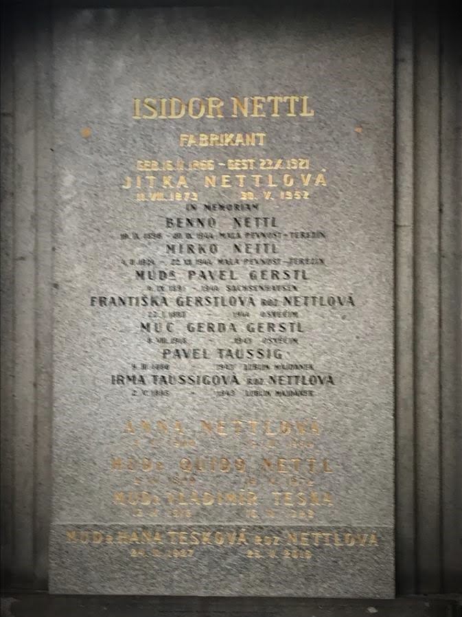 When I had the writing on our family tomb renovated, I changed the colour depending on whether they were just the names of the Holocaust victims or people who were actually buried there. Only the people with the inscriptions in gold are buried here. Nobody knows where the other ones ended. My mother’s name is the last so far.Her Brother Mirko Nettl and her Father Benno Nettl were killed by the Nazis.